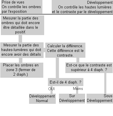Enfin une pose moyenne (ouverture 11) mettra la partie claire en zone 6 mais la partie sombre serait en zone 4, donc d'une zone trop claire. La solution consiste à prendre la photo avec l'ouverture f/16 et de prolonger le développement par la suite. Ainsi on fera monter la zone 5 en 6 sans affecter la zone 3, puisque cette dernière se trouve en dessous de la zone 5. Pour conclure, résumons sous forme de tableau la situation de la prise de vue et celle du développement. -=-=-=-=-=-=-=-=-=-=-=-=-=-=-=- D'après "Le nouveau photocinéma" - mars 1979 - Michael Zock CJ88-V1.0-13289 | ||||||||||||||||||||||||||||||||||||||||||||